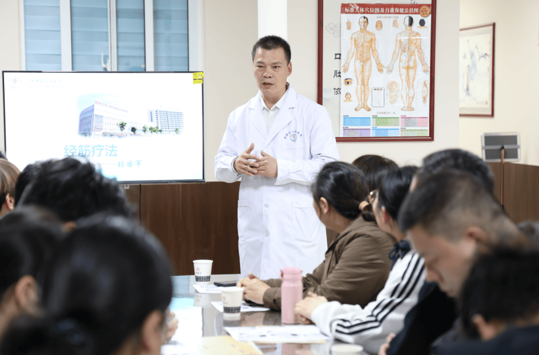 在理论授课环节,张国军老师以“经筋与人体气血运行的关系”为切入点,结合多媒体课件、黑板图示与中医教具,深入浅出地讲解了经筋系统的构成、功能及其在疾病发生发展中的关键作用。他指出:“经筋是经络的‘筋肉系统’,是疾病外现的通道,也是治疗的切入点。掌握经筋走向与结点,是实现精准调理的关键。”